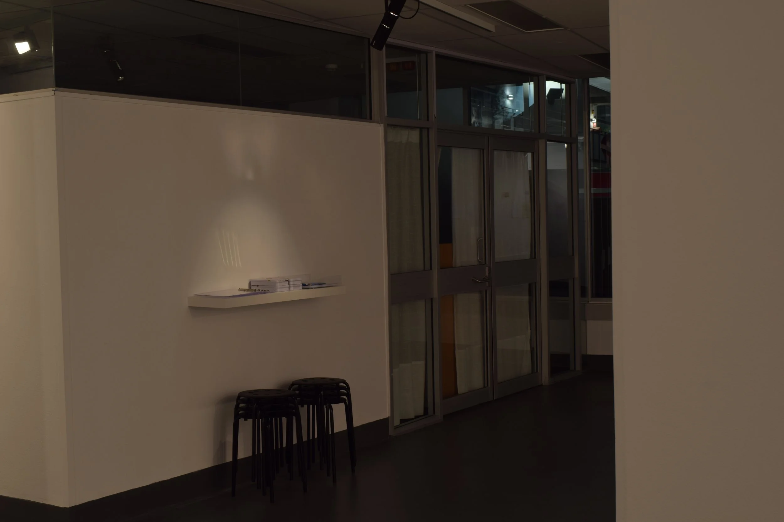 You are encouraged to refrain from entering the space behind this dividing wall before participating in this activity to retain the purity and individuality of your response. Read or listen to the description of the work, as given by the artist, and carefully experience the work as it occurs within your mind. Remember to linger on the work, really allow your mind to explore it fully. Give physical, visual expression to your encounter with the work. You may interpret your experience however you like. Feel free to make use of the stools, pencils, paper and clipboards provided. Once your response is complete, you may explore the area behind this dividing wall, feel free to attach your response to a section of wall or dividing wall in this area using the blu tack provided.